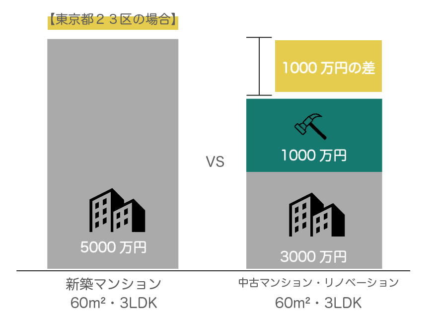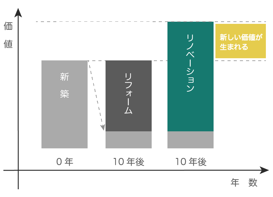 ▶リノベーションとリフォームのちがい ▶新築VSリノベ ▶憧れの土地に住める ▶リノベ不動産が選ばれる理由 【リノベーション】と【リフォーム】のちがい 新築物件を購入後、年月の経過と共に建物は劣化していきます。 従来の【リフォーム】は、それを「元の状態に戻すこと」を指します。あくまで現状回復なので、新築を上回る価値は生まれません。 一方【リノベーション】は、新たな間取りやデザインを加え、イマドキの暮らしやすさを実現させることが可能です。 新築時よりも新しい価値を生み出すことが可能になります。 新築よりも低価格での購入が実現 東京都23区の場合、新築マンションを購入するとなると3LDK(60㎡)でおよそ5000万円。 一方、同様のマンションを中古で購入すると3000万円。リノベーションに1000万円かけたとしても、差額は1000万円! ご予算を物件の購入や土地代にまわすのではなく、インテリアや内装にまわすことが可能になります! 憧れの土地や好立地に住める 中古物件は駅近や好立地エリアに建っていることが多いです。 新築では手が出ないエリアでも、中古物件なら憧れの土地に住めてしまうかも!? 一緒に探しましょう。 リノベ不動産が選ばれる理由 物件購入からリノベーションまで一気通貫 ONE STOP SOLUTION 『家を買おう』と思ったときに必要になる工程の全てを網羅。資金相談、不動産探し、デザイン/設計、リノベーション施工、インテリア相談、アフターサービスまで、ワンストップでお手伝い!国内最大級のリノベ実績を誇ります。安心してお任せください。 安心のアフターサポート TEATSUKU 5年間すべてのお客様へアフターサポートを付帯。 設備延長保証・緊急駆け付けサービス・コンシェルジュサービス・コールセンターなど、 引き渡し後も手厚く保証させていただきます。 期間中は何度でも無料で修理/補修が可能!詳しくはお問合せください。 施工事例を見る 問い合わせる